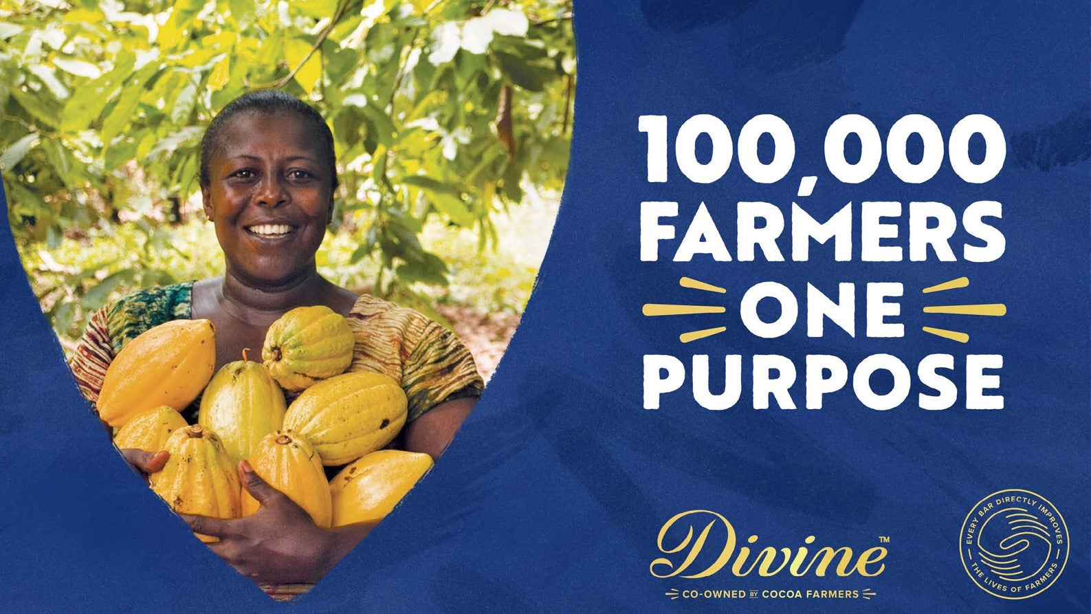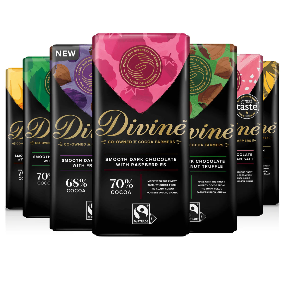 Divine har ett uppdrag – att sätta stopp för exploatering genom att sätta människor i första rummet. Vi är det enda Fairtrade-certifierade chokladföretaget som ägs tillsammans med bönderna själva. Det betyder att de får ta del av vinsten de skapar, har inflytande över hur företaget drivs och att deras röster verkligen blir hörda.